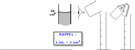 - En utilisant la pissette, compléter le volume d’eau pour arriver exactement à la graduation 50 cm3.