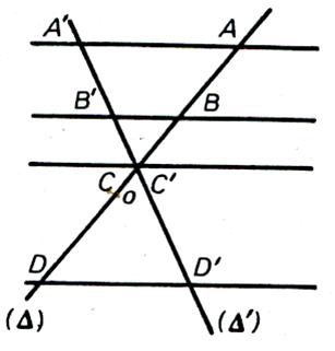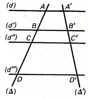 Ainsi la propriété de Thalès pour deux droites sécantes : Des droites parallèles