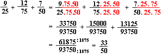 Exemple: somme de 9/25, 12/75 et 7/50 dont les dénominateurs sont 25, 75 et 50.