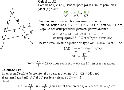 Exemple: Les droites parallèles d et d' coupent les droites sécantes (Ax) et (Ay) comme il est indiqué sur la figure ci-dessous. Les dimensions sont en centimètres (la figure ne respecte pas ces dimensions).
