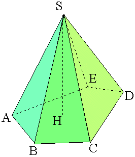 Nous obtenons une pyramide en joignant les sommets d'un polygone à un même point pris à l'extérieur du plan de ce polygone. La figure ci-contre a été obtenue en joignant les sommets A, B, C, D et E du polygone ABCDE au point S. S est appelé sommet de la pyramide. Les triangles SAB, SBC, SCD, SDE et SEA sont les faces latérales de la pyramide. Les segments [SA], [SB], [SC], [SD] et [SE] sont les arêtes latérales de la pyramide. Le polyèdre ABCDE est la base de la pyramide. Le segment [SH] tel que (SH) soit perpendiculaire au plan de la base, est appelé hauteur de la pyramide (le mot "hauteur" désigne aussi la longueur SH de ce segment). |