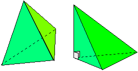 Un tétraèdre est une pyramide à base triangulaire. Il possède six arêtes et quatre faces qui peuvent, chacune, faire office de base. Sur l'une des figures ci-contre nous avons représenté un tétraèdre dont deux faces sont des triangles rectangles. Il est possible que trois faces soient des triangles rectangles, mais pas les quatre faces. |
