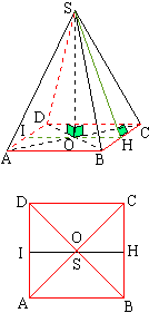 Comme ABCD est un carré alors le centre de la base est l'intersection des diagonales (ou des médianes comme [IH]). Le point H est le milieu de [BC]. L'apothème est [SH]. De nombreux calculs peuvent être effectués dans ce type de pyramide. Très souvent c'est le théorème de Pythagore qui est mis à contribution. Pour l'utiliser il faut découvrir le "bon" triangle rectangle (ce qui n'est pas toujours très visible sur la figure). Voici, sur les figures ci-dessous quelques uns d'entre eux: