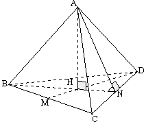 Si A est considéré comme le sommet du tétraèdre régulier alors la face BCD est considérée comme sa base. La hauteur [AH] passe par l'intersection des médianes du triangle équilatéral de base (M et N sont des milieux d'arêtes). |