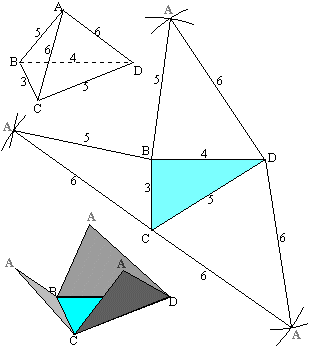Le tétraèdre ABCD est donné avec toutes les longueurs de ses arêtes (ce qui simplifie le problème: bien souvent vous devrez les calculer). Il est d'abord représenté en perspective en prenant A comme sommet et BCD comme base; puis après un commencement de dépliage, afin de bien comprendre la méthode. Exécutez le patron en commençant par dessiner la base BCD (ce qui revient à dessiner un triangle connaissant les longueurs de ses trois côtés). Sur chacun des côtés de BCD construire les triangles représentant les faces latérales: ABD, ABC et ACD.