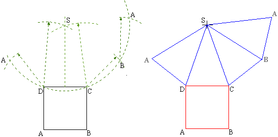 La seconde façon est très conseillée pour dessiner les patrons des pyramides régulières du fait que leurs arêtes latérales ont la même longueur. Soit la pyramide SABCD où ABCD est un carré de côté 3cm de centre O et de hauteur SO=4cm (nous aurions pu vous donner l'apothème au lieu de la hauteur: les calculs se font alors dans le triangle SHB rectangle en H). Il nous faut tracer un arc de cercle de rayon SA (longueur d'une arête latérale). Comme SOB est rectangle en O alors SB2=SO2+OB2 (1) (théorème de Pythagore). Nous connaissons SO. OB est la moitié de DB longueur d'une diagonale du carré ABCD. Comme ADB est rectangle en A alors DB2=AD2+AB2. Donc : DB2= 32+32 et DB2=18. La longueur d'une diagonale est donc environ 4,24cm (racine carrée de 18). De OB=DB/2 nous obtenons OB=2,12cm environ. En remplaçant dans la formule (1) SO et OB par leur valeur: SB2=42+2,122 (environ) La longueur d'une arête est donc de 4,5cm environ. |