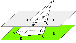 La face SAB est un triangle contenu dans le plan (SAB). Comme le plan (SAB) coupe les deux plans parallèles (plan de base et plan de section) alors ses intersections avec ces deux plans sont des droites parallèles: (A'B') est donc parallèle à (AB). De même pour (B'C') et (BC), (C'D') et (CD), (D'A') et (DA). La section plane de cette pyramide est donc un quadrilatère dont les côtés sont parallèles au quadrilatère de base. Comme (SH) est perpendiculaire au plan de base qui est parallèle au plan de section alors (SH) est perpendiculaire au plan de section en un point H'. |