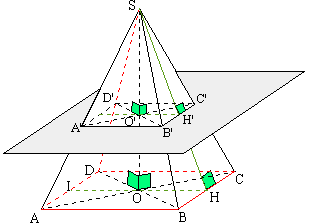 Soit SABCD pyramide régulière à base carrée de sommet S. La section est un carré A'B'C'D' dont les côtés sont parallèles aux côtés correspondants du carré de base de la pyramide SABCD. La hauteur (SO) de la pyramide SABCD passe par le centre O' du carré A'B'C'D'. (SO) est perpendiculaire au plan de section. OO' est la distance du plan de section au plan de la base de la pyramide SABCD La pyramide SA'B'C'D' est aussi une pyramide régulière. |