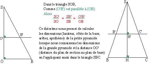 Comme les droites (O'B') et (OB) sont les intersections de deux plans parallèles (plan de base et plan de section) et du plan (SOB) alors ces deux droites sont parallèles (de même pour (OH) et (O'H') contenues dans le plan (SOH), (BC) et (B'C') contenues dans le plan (SBC), ...).