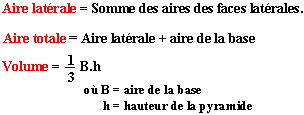 Cette formule est valide pour toutes les pyramides régulières (si la base est un polygone régulier de n côtés mesurant c, son aire latérale est n.(c.a)/2=(n.c.a)/2 où le périmètre de base est n.c).