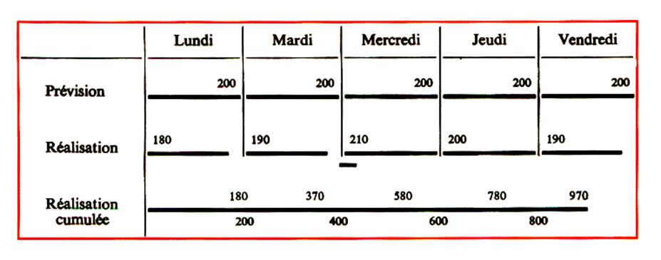 rapidement le rendement obtenu pendant une période donnée par une machine , une équipe d’ouvriers , .. ;et les prévisions de fabrication envisagées . |