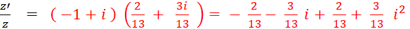 « z » par le terme ( 2 – 3 i ) et z’ par le terme ( - 1 + i ) |