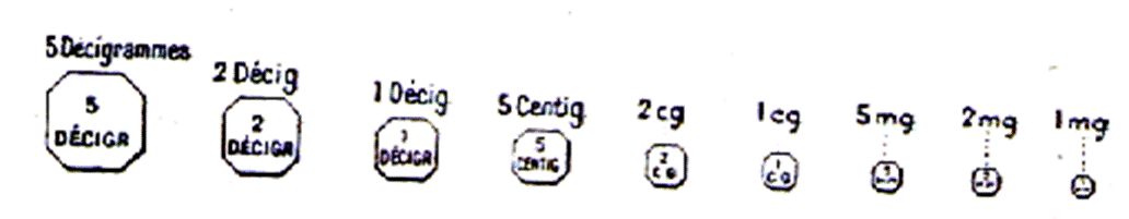 demi- gramme au milligramme. 5dg ; 2 dg ; 1dg ;5 cg ;2