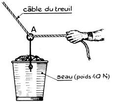 Un seau plein de terre pèse 40 N. Il est suspendu au câble d’un treuil par l’intermédiaire d’un