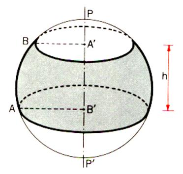 Une zone sphérique est la partie d’une sphère comprise entre deux plans parallèles .Si l’un des plans est tangent à la sphère , la zone porte le nom de « calotte sphérique ». L’aire A de la zone limitée par des plans à la distance